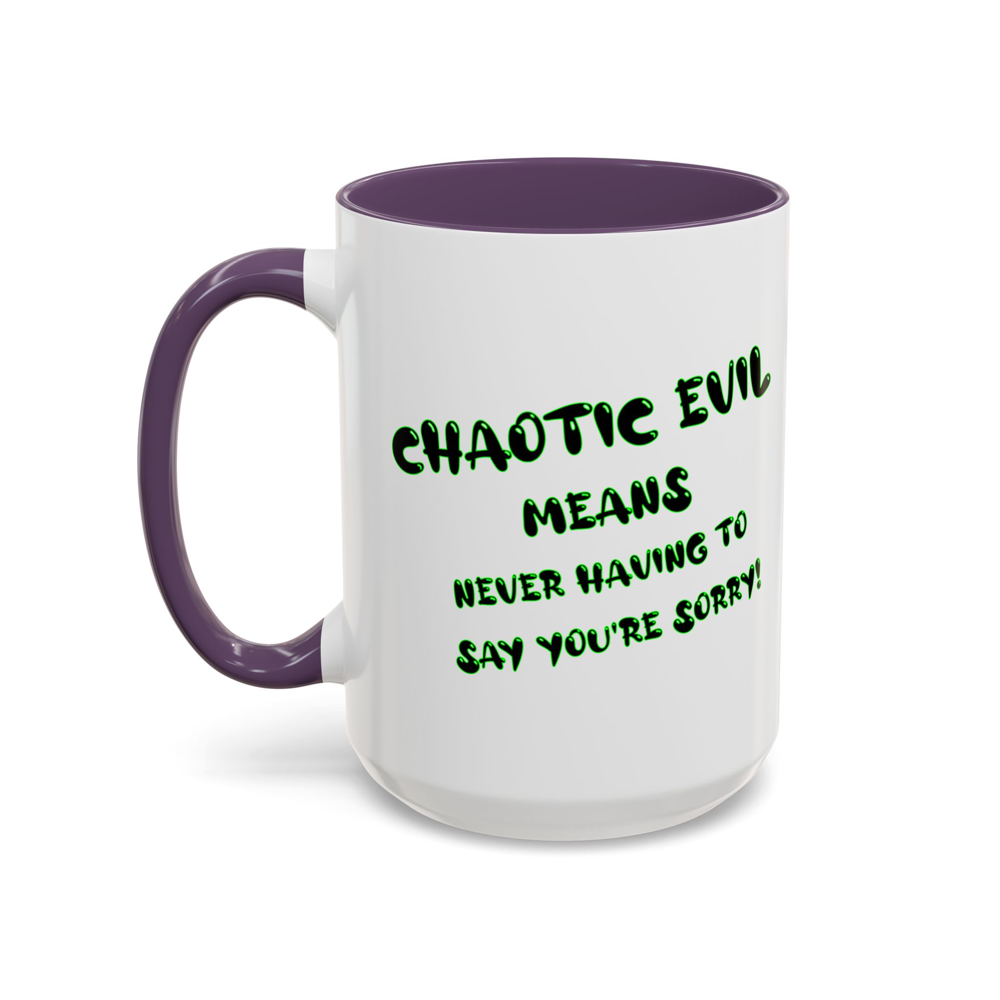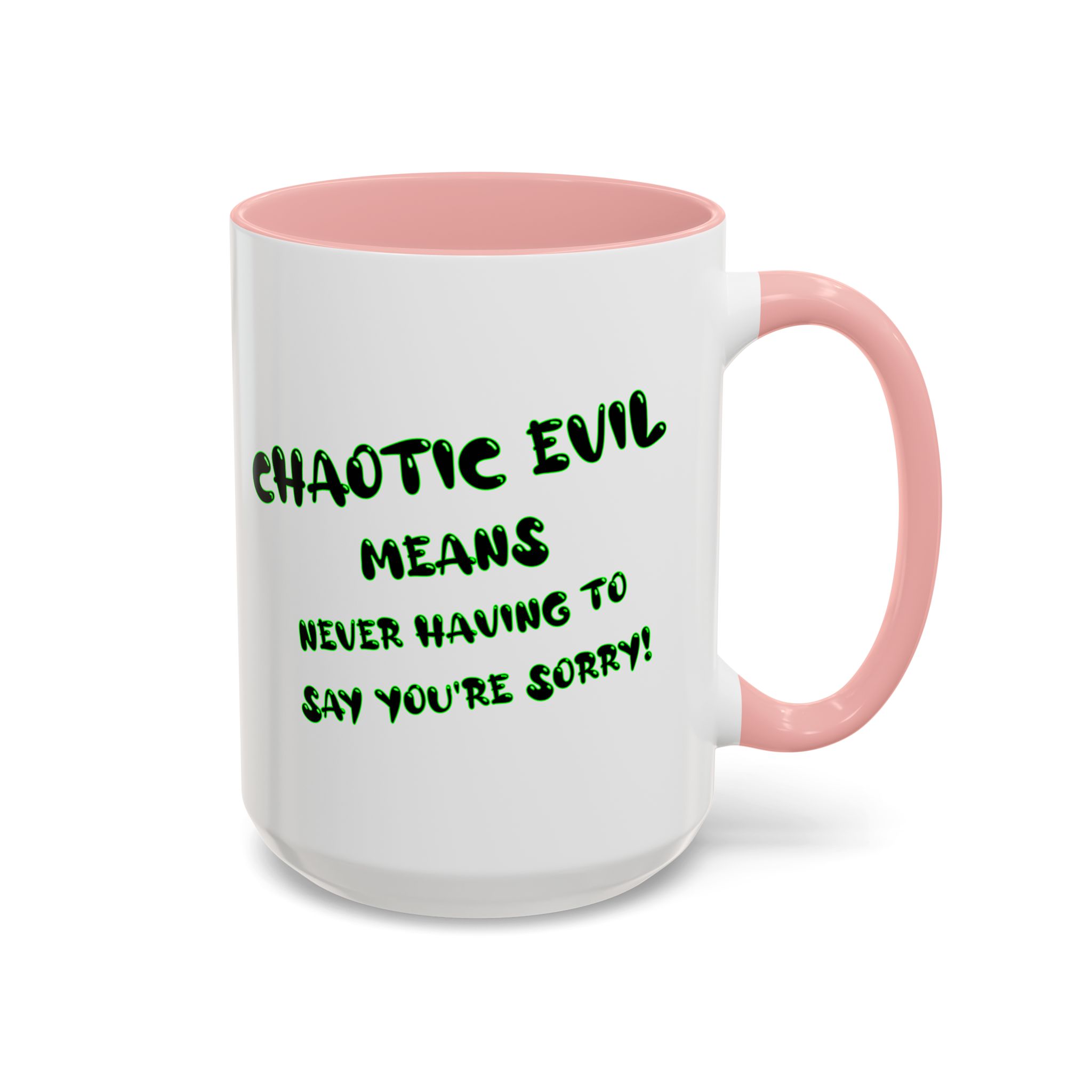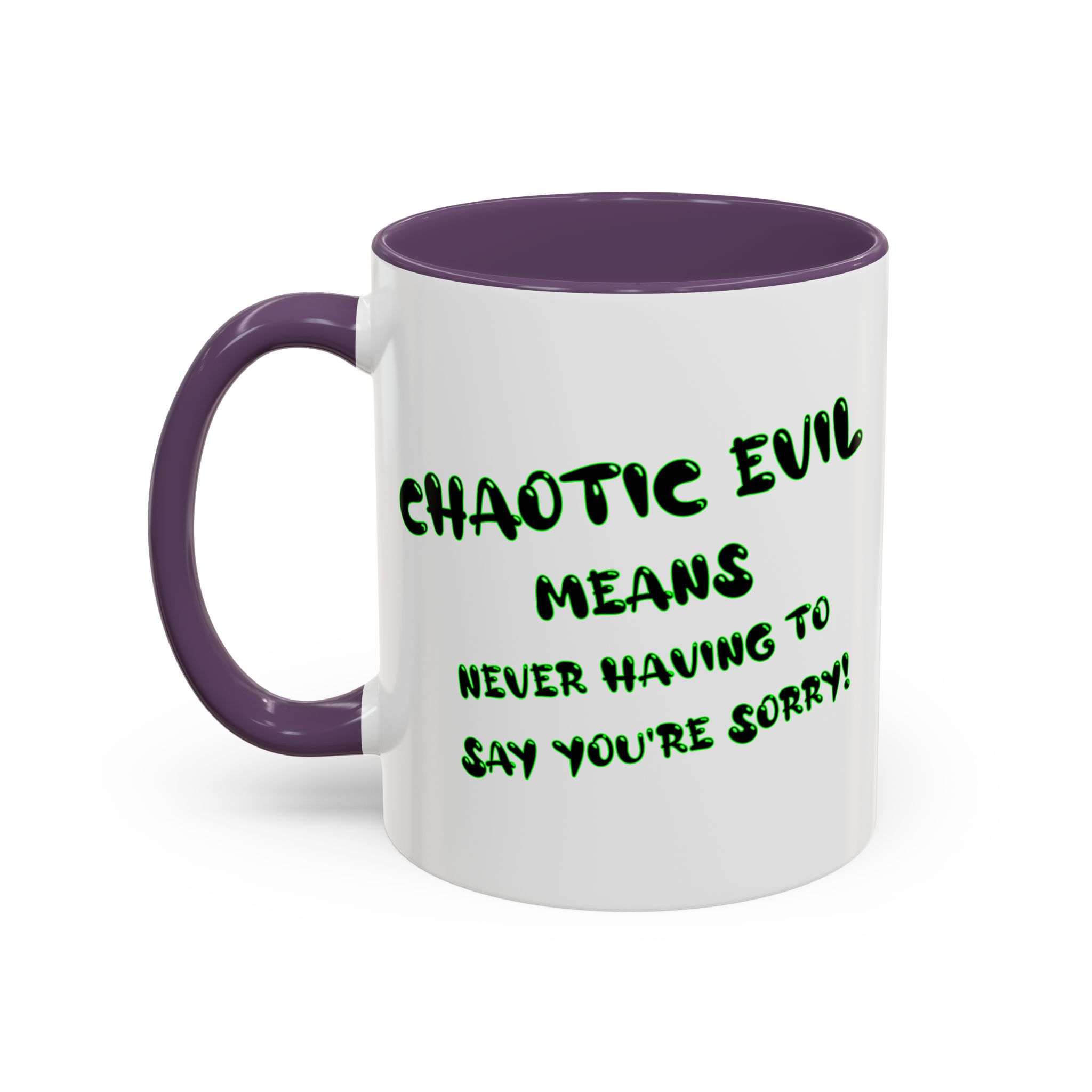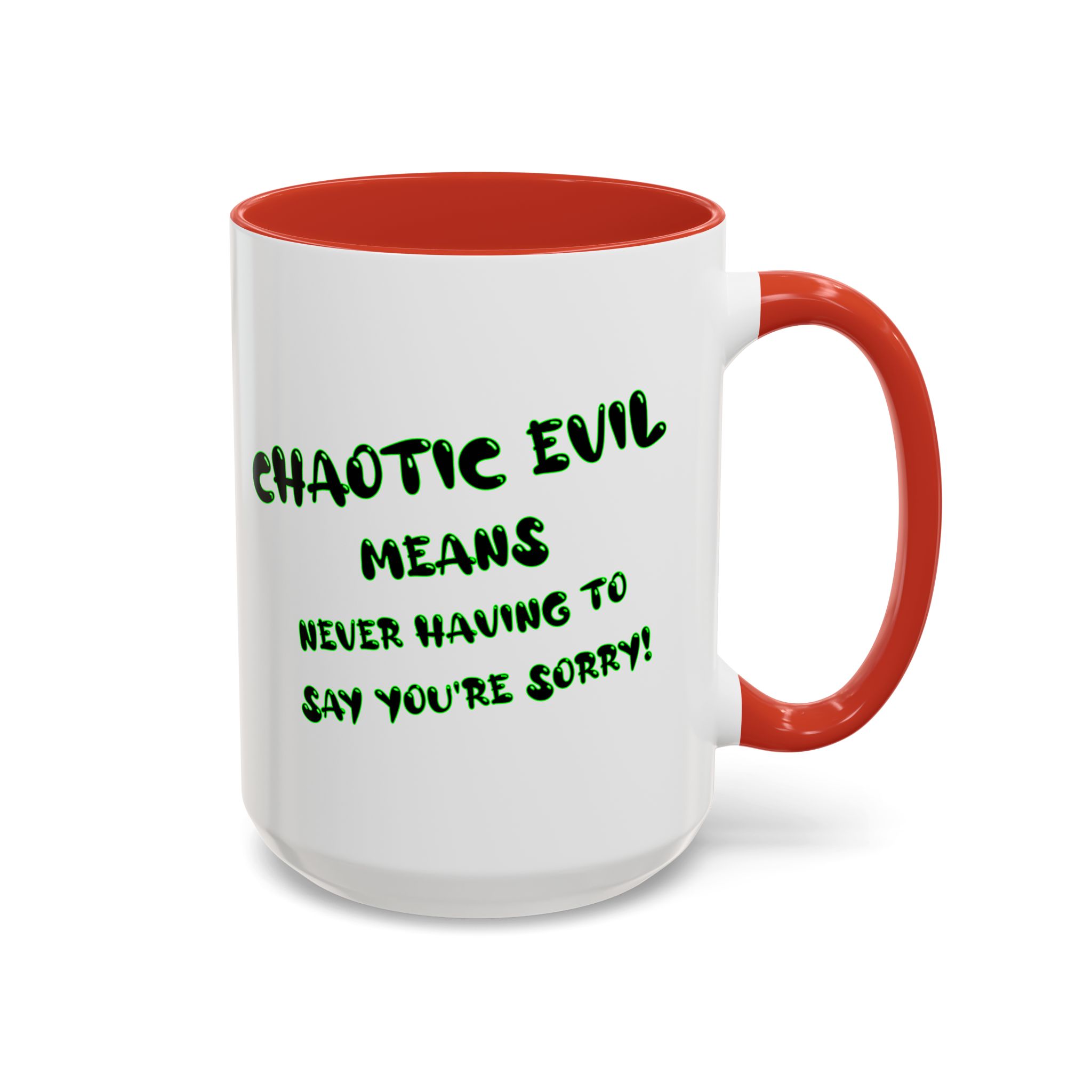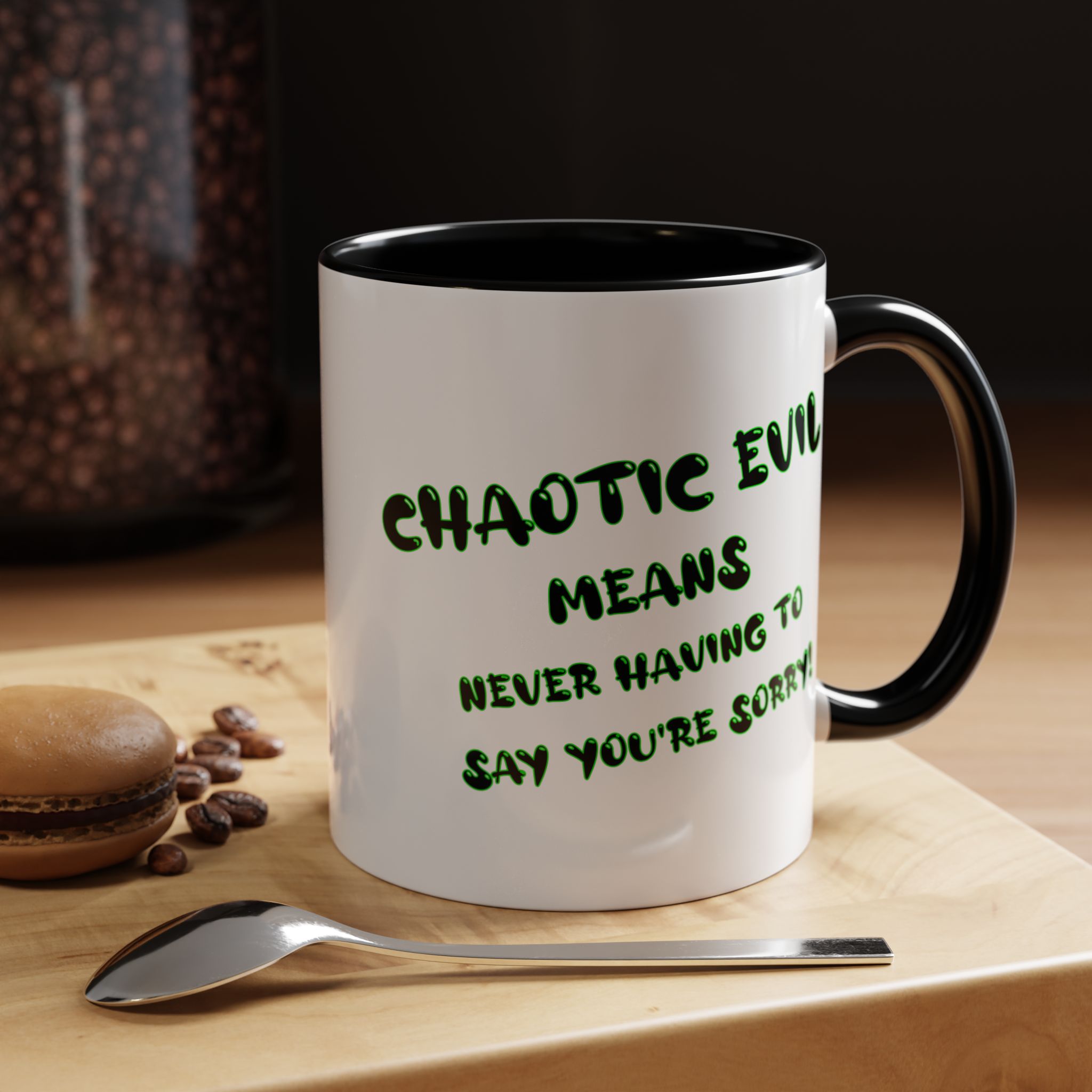 This eye-catching coffee mug features the quote “Chaotic evil means never having to say you’re sorry.” Perfect for those who appreciate a touch of humor in their morning routine, and those who like being a little unpredictable. This mug is microwave and dishwasher-safe, available in 11oz or 15oz sizes, and made of lead and BPA-free material. Ideal for gifting on birthdays, holidays, or to anyone with a fun and quirky sense of style.