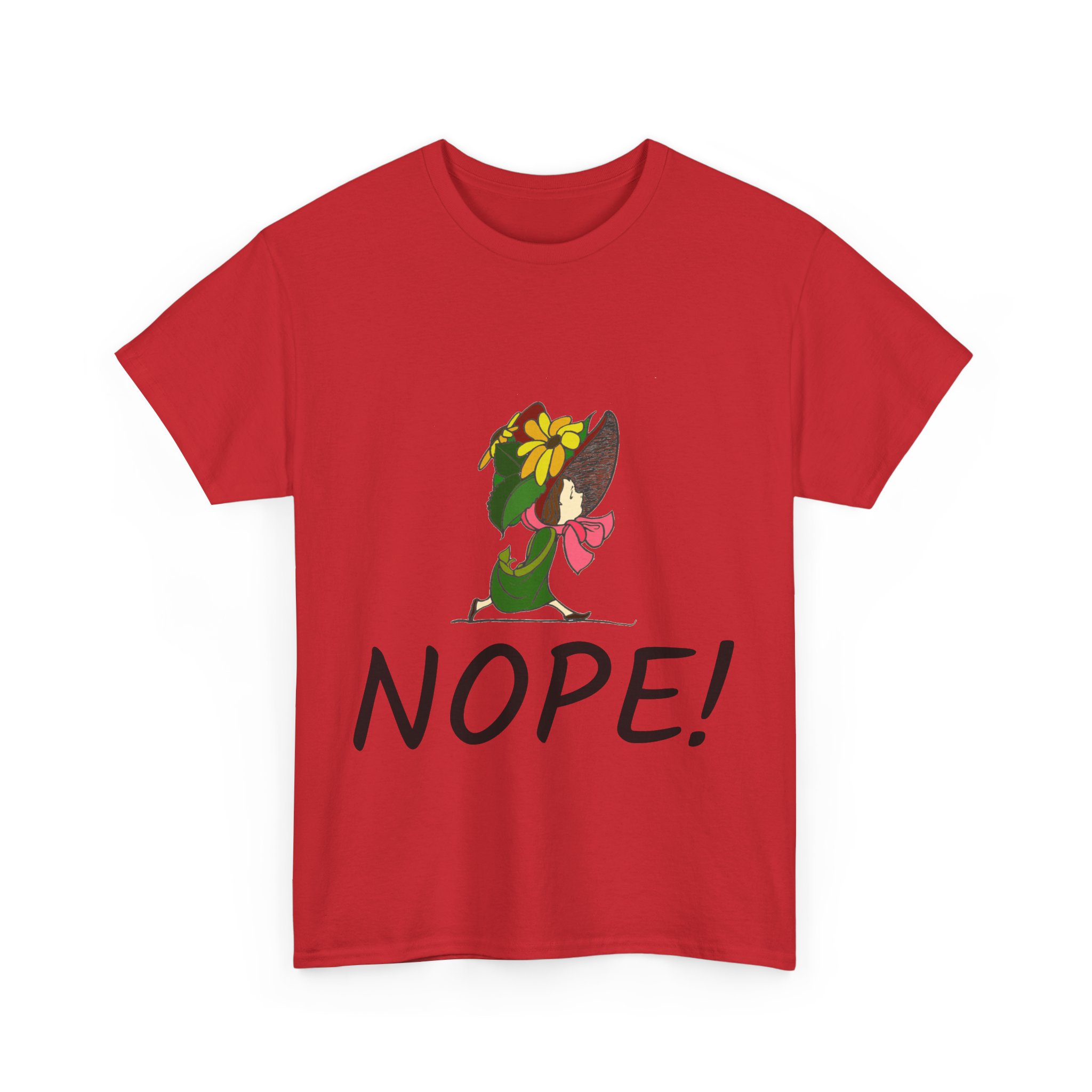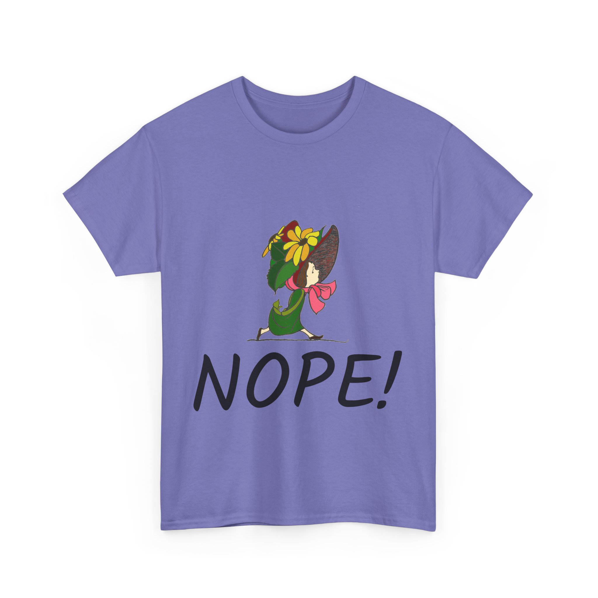 This vibrant and eye-catching Tee Shirt features a cartoon of a young lady in a flowery bonnet marching away determinedly with the word “NOPE”. Perfect for those who appreciate a touch of humor in their wadrobe, and those who have just had enought of, well, everything.