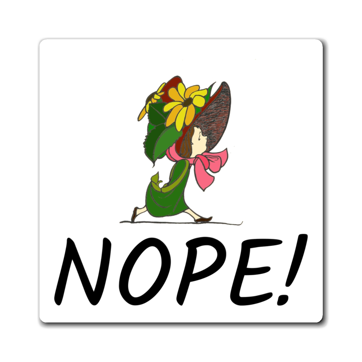 These vibrant and eye-catching magnets features a cartoon of a young lady in a flowery bonnet marching away determinedly with the word “NOPE”. Perfect for those who appreciate a touch of humor in their life, and those who have just had enought of, well, everything.  These strong, fast holding magnets firmly adhere to any metallic surface, get yours today!